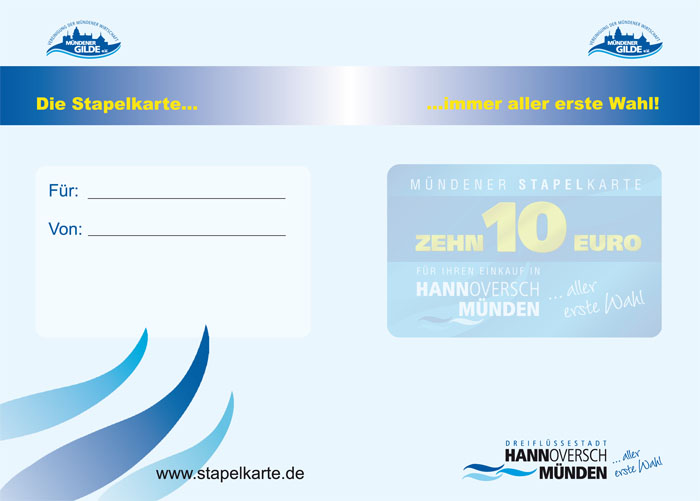 Aus der Initiative der Mündener Gilde heraus, wurde das Gutscheinsystem erfolgreich im Dezember 2006 eingeführt. Eine Stapelkarte, in Form einer Scheckkarte, hat einen Wert von 10 € und kann in über 100 Mitgliedsbetrieben der Mündener Gilde eingesetzt werden. Folgedessen bleibt die Kaufkraft in jedem Fall in Hann. Münden, denn nur hier kann der Gutschein eingelöst werden. Welche Betriebe dabei sind, wird aus einer beim Stapelkartenkauf mitgegebenen Liste ersichtlich.